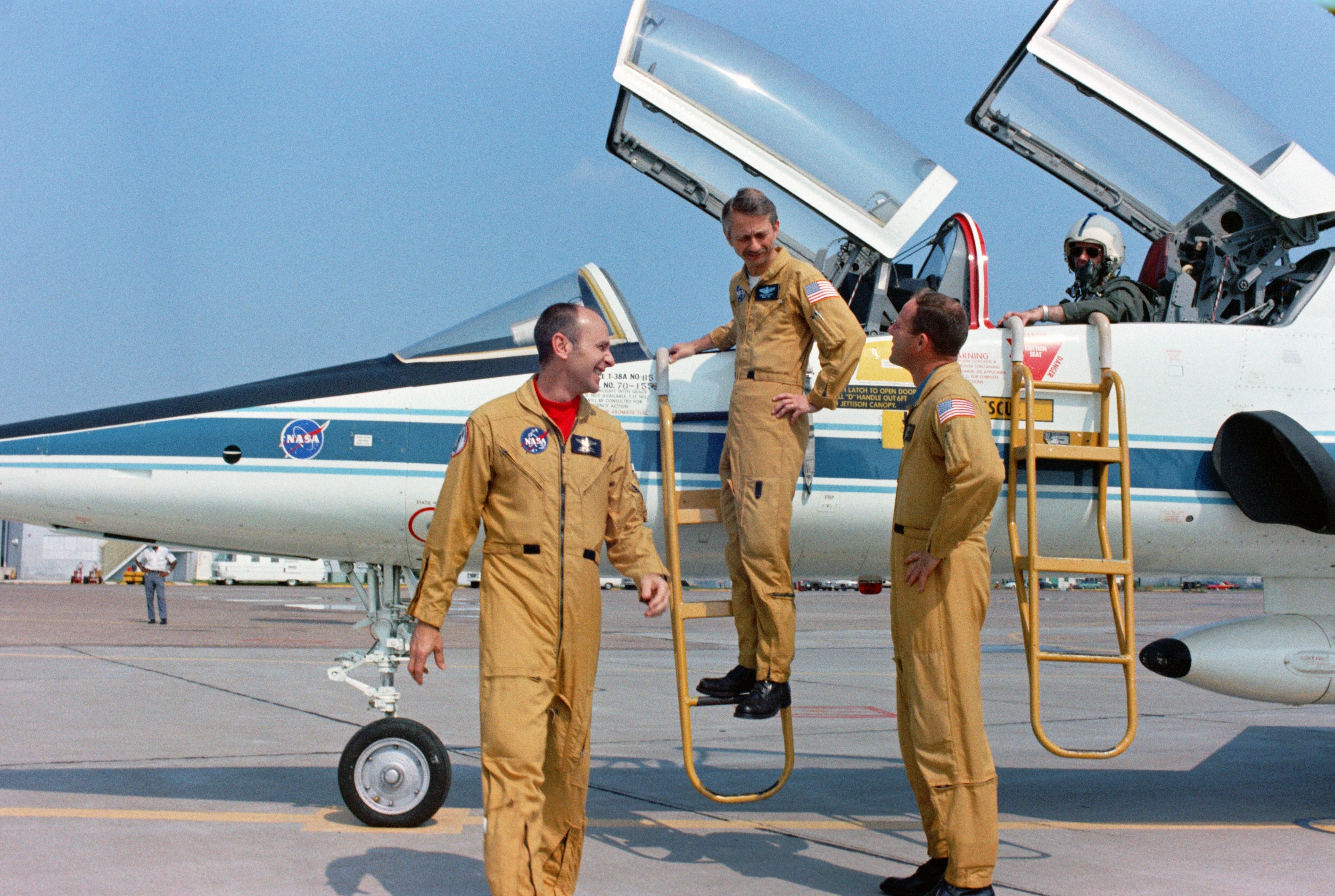 Bean, left, Garriott, and Lousma arrive at Patrick AFB.jpg