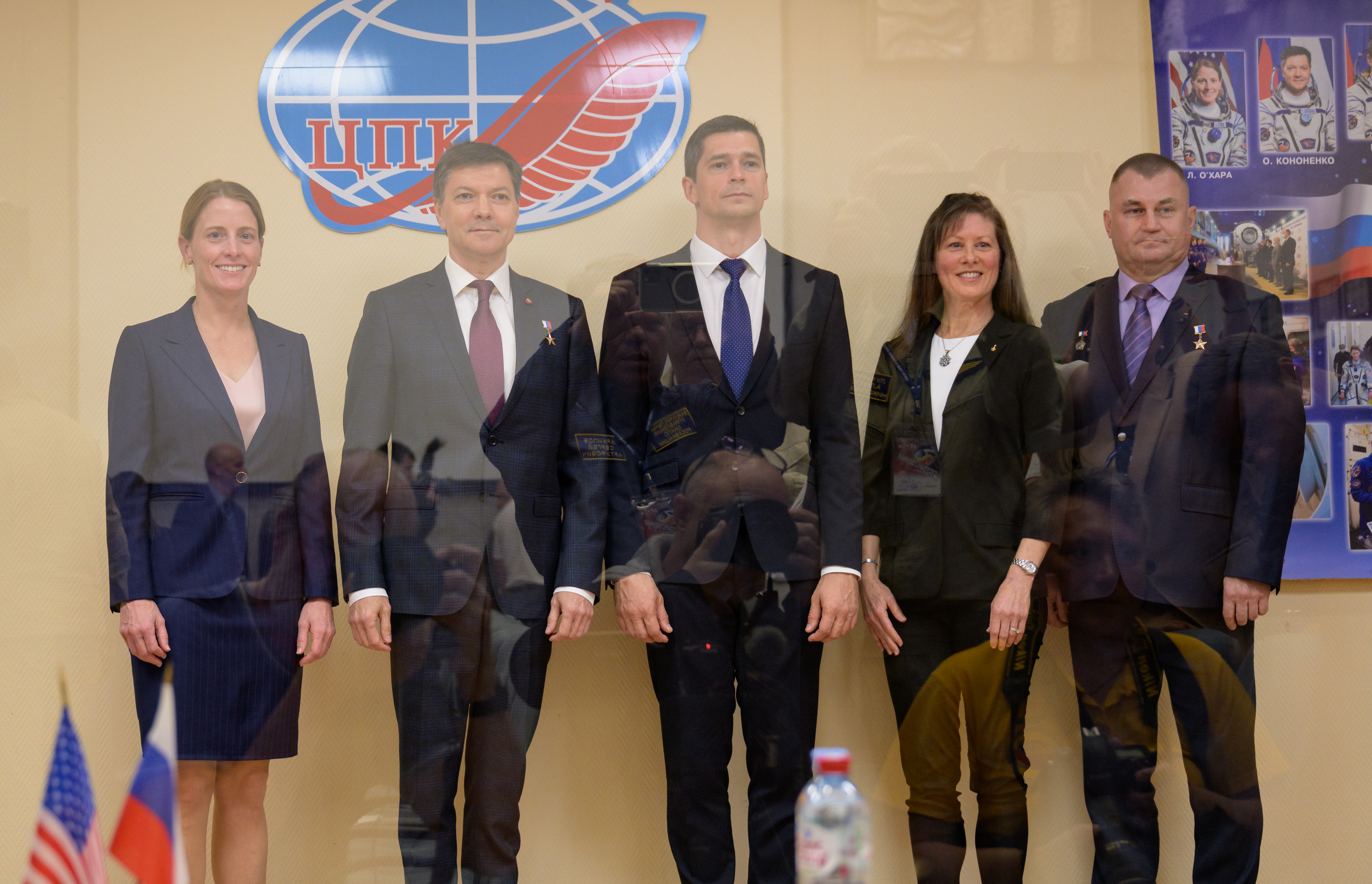 English: Expedition 70 prime crew NASA astronaut Loral O'Hara, left, Roscosmos cosmonauts Oleg Kononenko, and Nikolai Chub, along with backup crew members Tracy Dyson and Alexey Ovchinin, right, are seen in quarantine behind glass during the State Commission meeting to approve the Soyuz launch of Expedition 70 to the international Space Station, Thursday, Sept. 14, 2023 at the Cosmonaut Hotel in Baikonur, Kazakhstan. Photo Credit: (NASA/Bill Ingalls) |