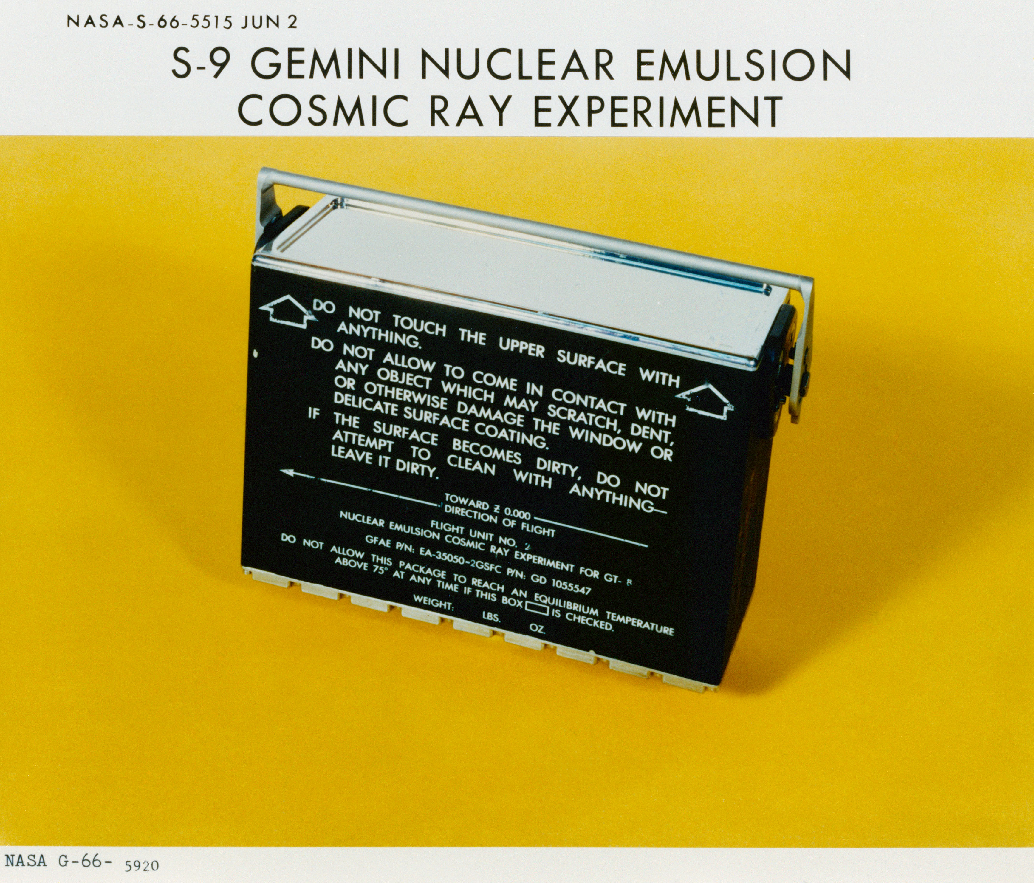 English: S66-05515 (2 June 1966) --- Gemini-11 Experiment S-9 Nuclear Emulsion. This experiment will be used to study the cosmic radiation incident on Earth's atmosphere, to obtain detailed chemical composition of the heavy primary nuclei and to search for rare particles. Equipment is a rectangular package eight and a half by six by three inches weighing 15 pounds and including the nuclear emulsion film stack, motor to advance the emulsion and a timer to regulate the motor. The package is mounted atop the spacecraft retro adapter section prior to launch, is activated at insertion, and is retrieved by the EVA pilot. The experiment is conducted with the spacecraft in plus or minus 15 degrees of Earth's average magnetic field vector. Sponsors are NASA's Office of Space Science and Applications and the U.S. Naval Research Laboratories. Photo credit: NASA |