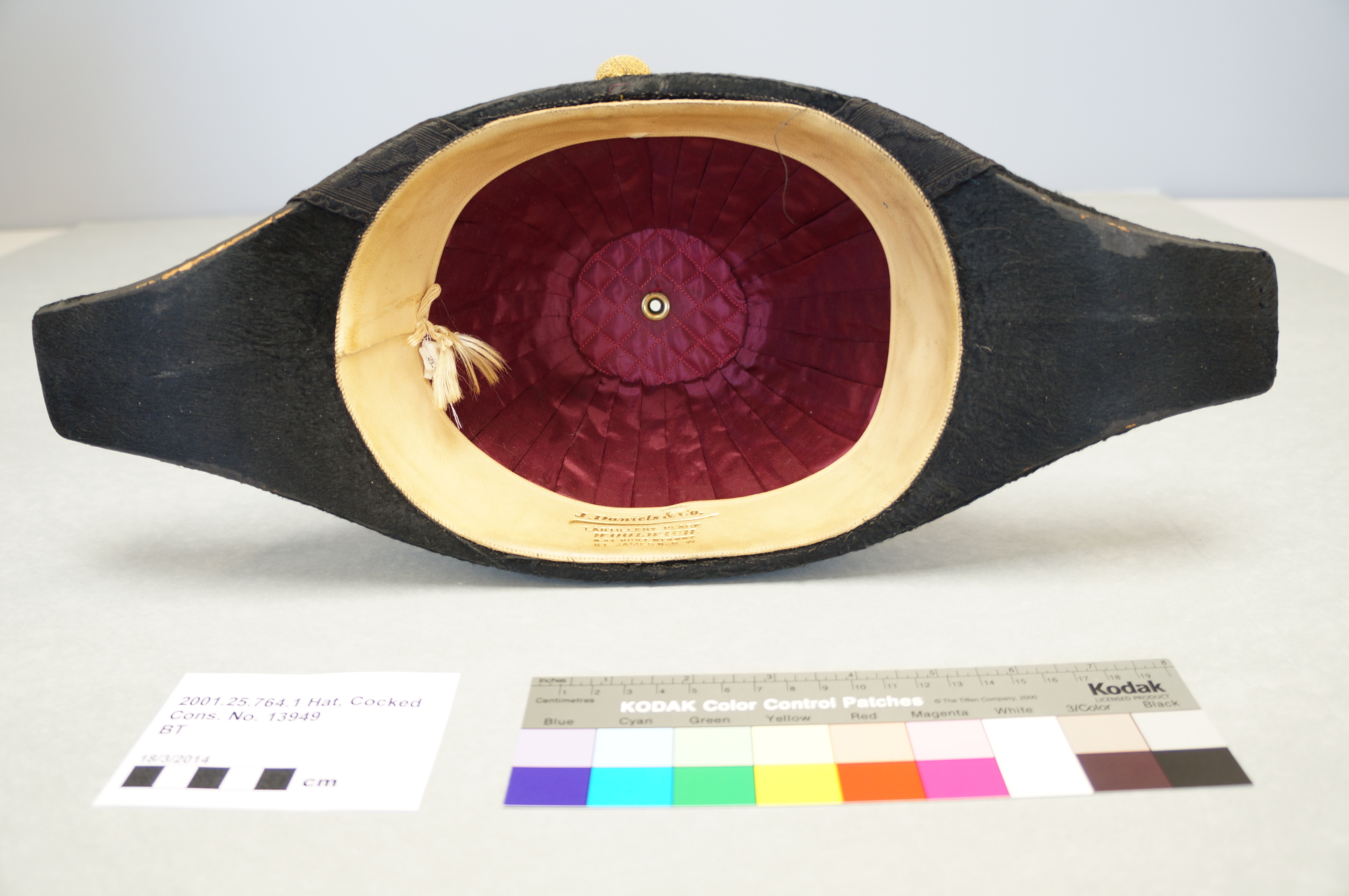 English: Black cocked hat (in hat tin) Part of uniform worn by Colonel George WS Patterson as Administrator in Samoa black velvet cocked hat, gold-embroidered vertical band with embroidered button at front over black bow, gold bullion trim either end, black braid trimming at either end, maroon silk lining, tan leather headband, stamped on band- "J. Daniels and Co. - 1 Artillery Place - Woolwich - and 34 Bury St. - St JAMES'S S.W."