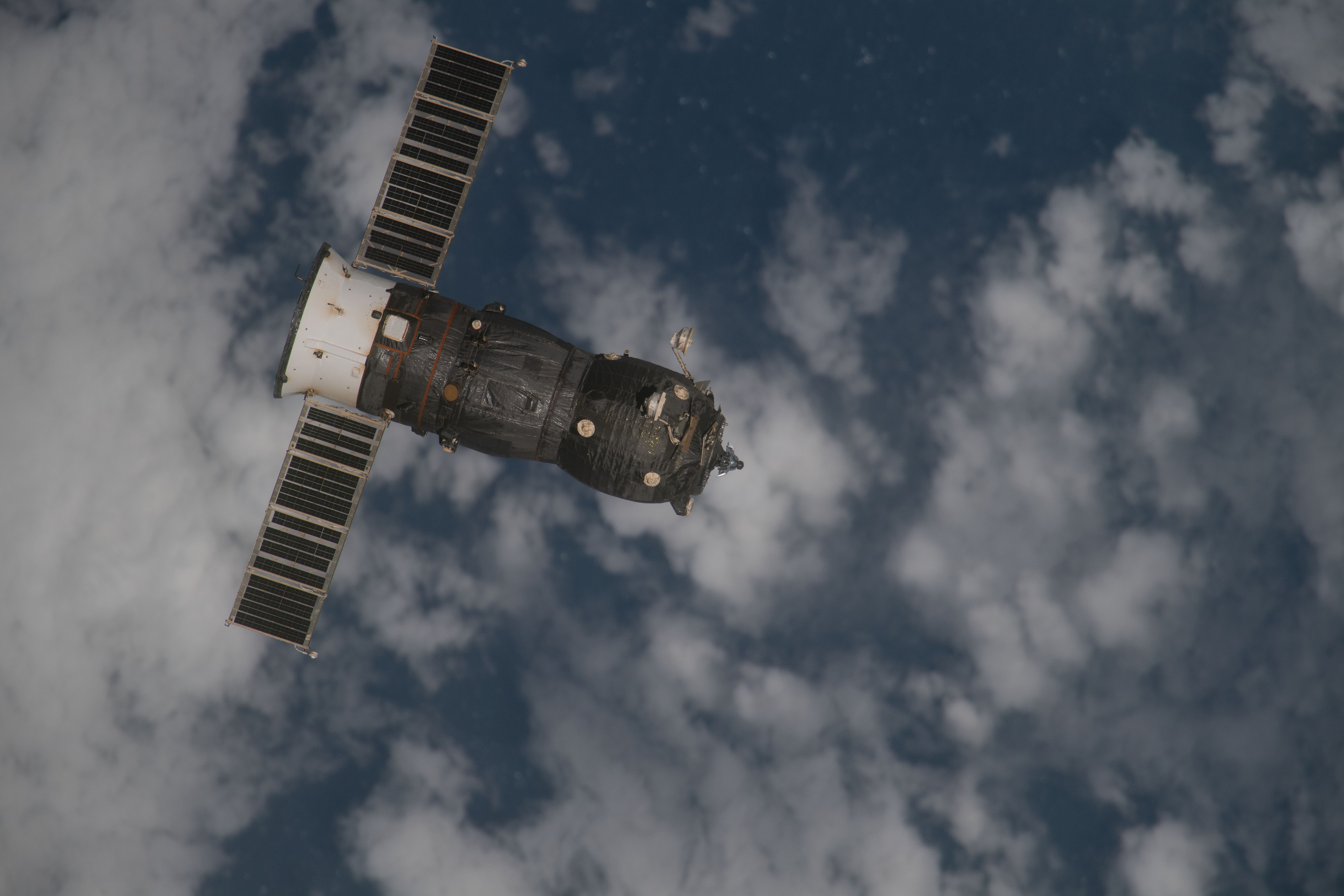 English: iss065e018827 (April 27, 2021) --- Russia's ISS Progress 75 cargo craft is pictured from the International Space Station after it undocked from the Zvezda service module's aft port where it stayed for just over a year. The trash-filled 75P reentered Earth's atmosphere above the South Pacific for a fiery, but safe demise a day later. |