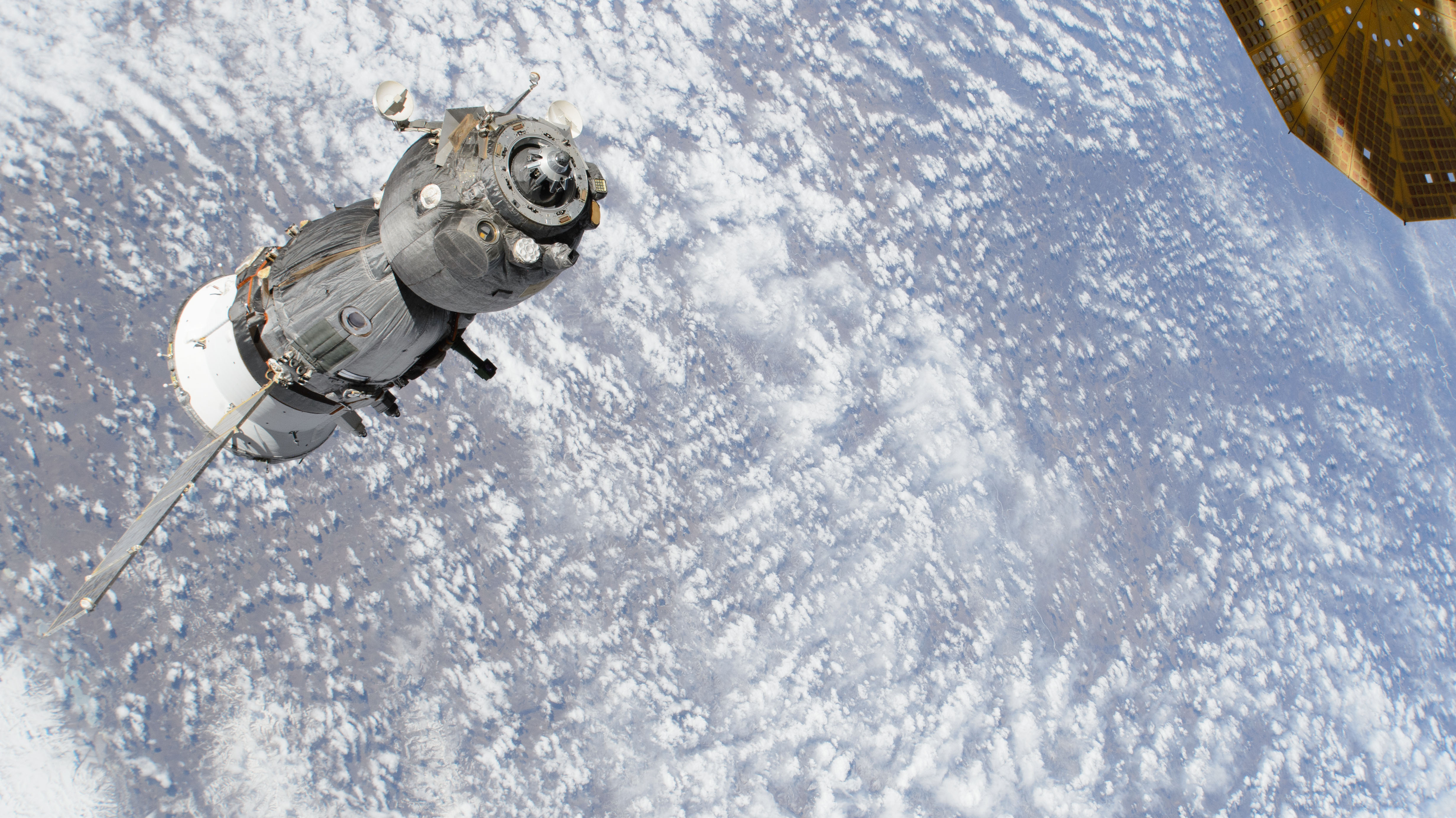 English: iss071e001344 (April 6, 2024) --- The Soyuz MS-24 spacecraft is pictured moments after undocking from the International Space Station's Rassvet module. Aboard the Soyuz crew ship for the ride back to Earth were NASA astronaut Loral O'Hara, Roscosmos cosmonaut Oleg Novitskiy, and Belarus spaceflight participant Marina Vasilevskaya. The orbital outpost was soaring 261 miles above northeast China at the time of this photograph. |