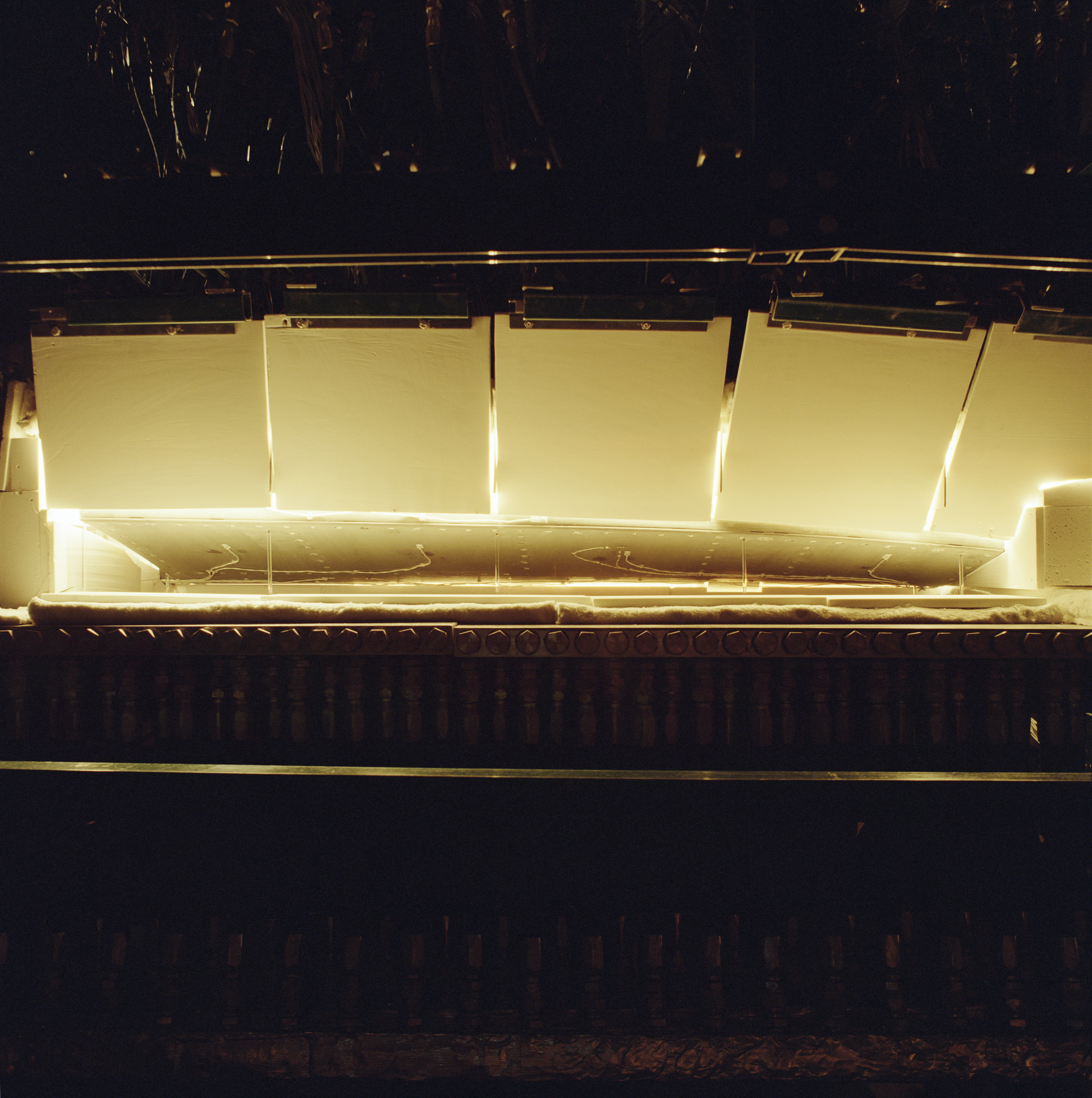 English: The X-37 advanced technology demonstrator flaperon unit was one of the first ever thermal and mechanical qualification tests of a carbon-carbon control surface designed for space flight. The test also featured extensive use of high-temperature fiber optic strain sensors. Peak temperatures reached 2,500 degrees Fahrenheit. |