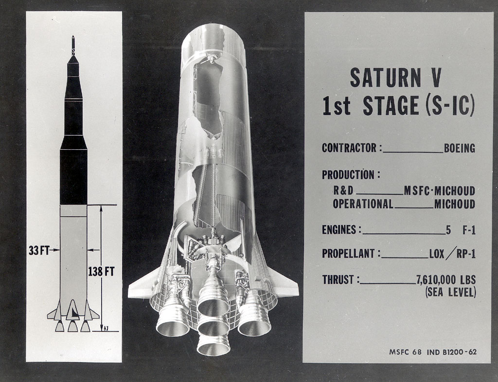 | current | 16:38, 22 March 2020 | 1,024 × 786 (165 KB) | wikimediacommons>Huntster | == {{int:filedesc}} == {{Information |Description={{en|1=This is a cutaway view of the Saturn V first stage, known as the S-IC, detailing the five F-1 engines and fuel cells. The S-IC stage is 138 feet long and 33 feet in diameter, producing more than 7,500,000 pounds of thrust through the five F-1 engines that are powered by liquid oxygen and kerosene. Four of the engines are mounted on an outer ring and gimbal for control purposes. The fifth engine is rigidly mounted in the center. When ign... |