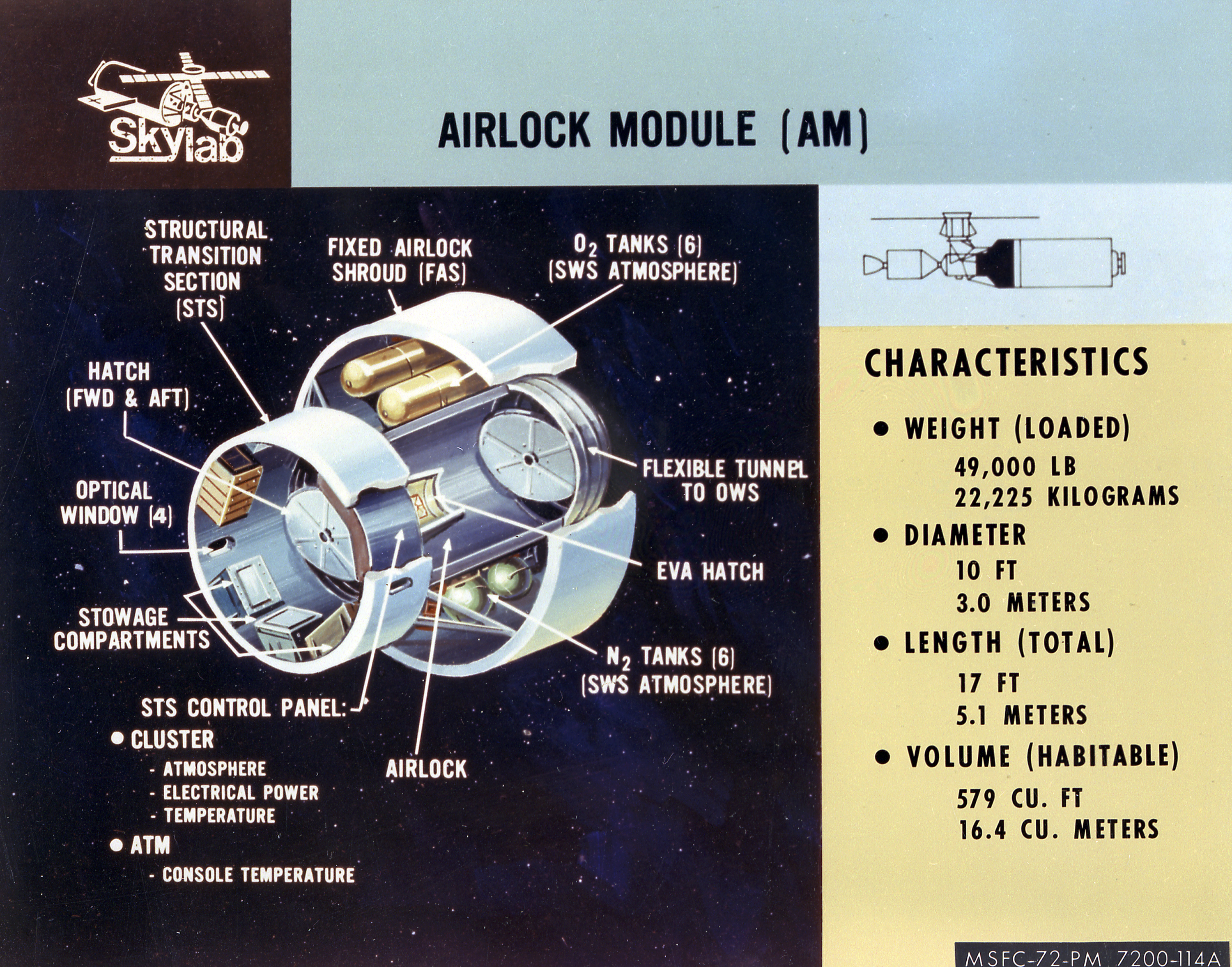 | current | 14:05, 23 April 2020 | 3,000 × 2,354 (6.74 MB) | wikimediacommons>Huntster | == {{int:filedesc}} == {{Information |Description={{en|1=This artist's concept is a cutaway illustration of the Skylab Airlock Module and its characteristics. The aft end of the Docking Adapter mated to the Airlock Module (AM), and served as the environmental, electrical, and communications control center. The docking adapter also contained the port through which the astronauts exited to perform extravehicular activity. The AM contained a turnel section through which Skylab crewmen could move... |