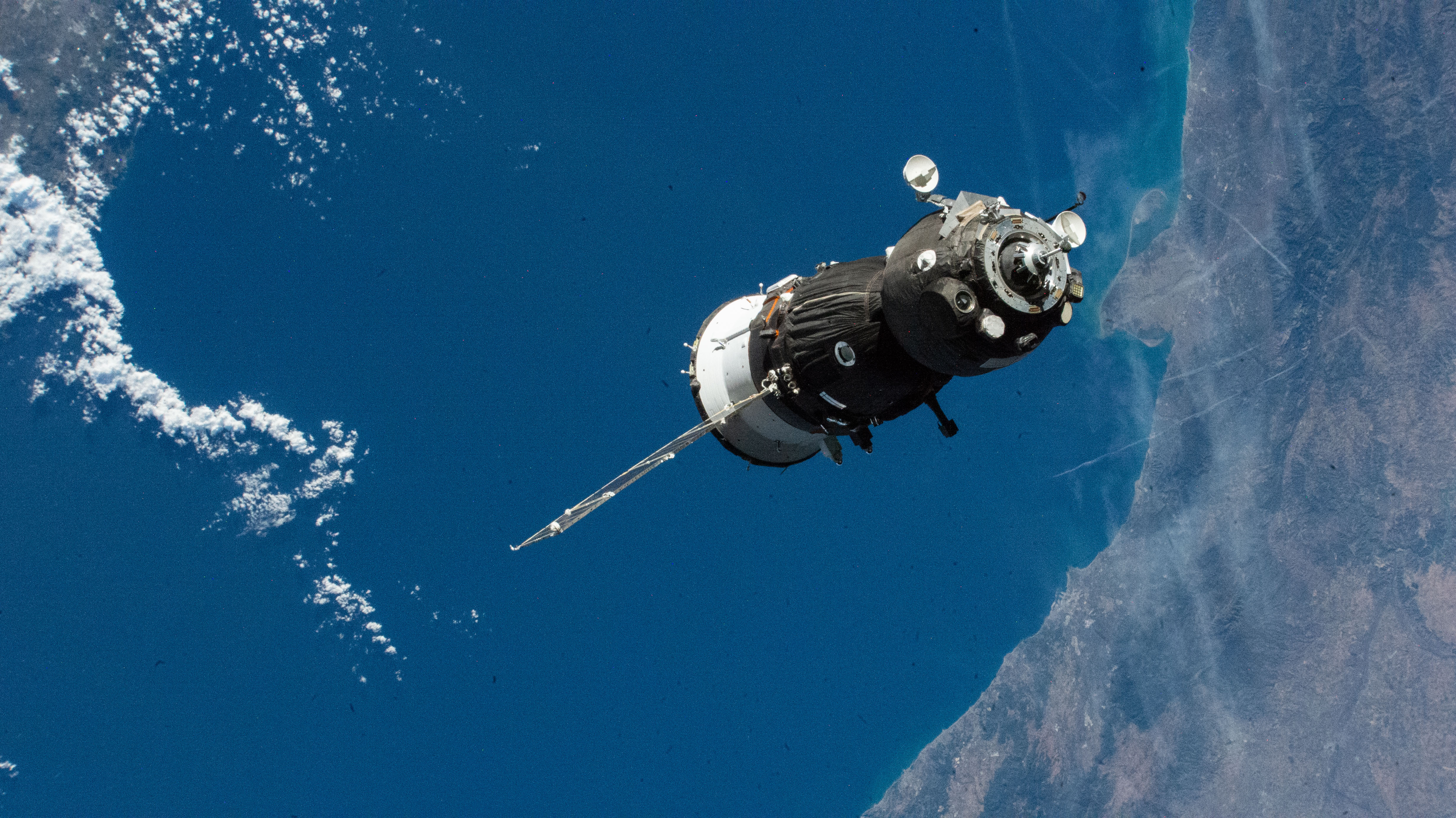 English: iss073e1197974 (Dec. 2, 2025) --- The Soyuz MS-28 crew spacecraft carrying NASA astronaut Chris Williams and Roscosmos cosmonauts Sergey Kud-Sverchkov and Sergei Mikaev approaches the International Space Station 263 miles above the Mediterranean Sea near the coast of Barcelona, Spain. |