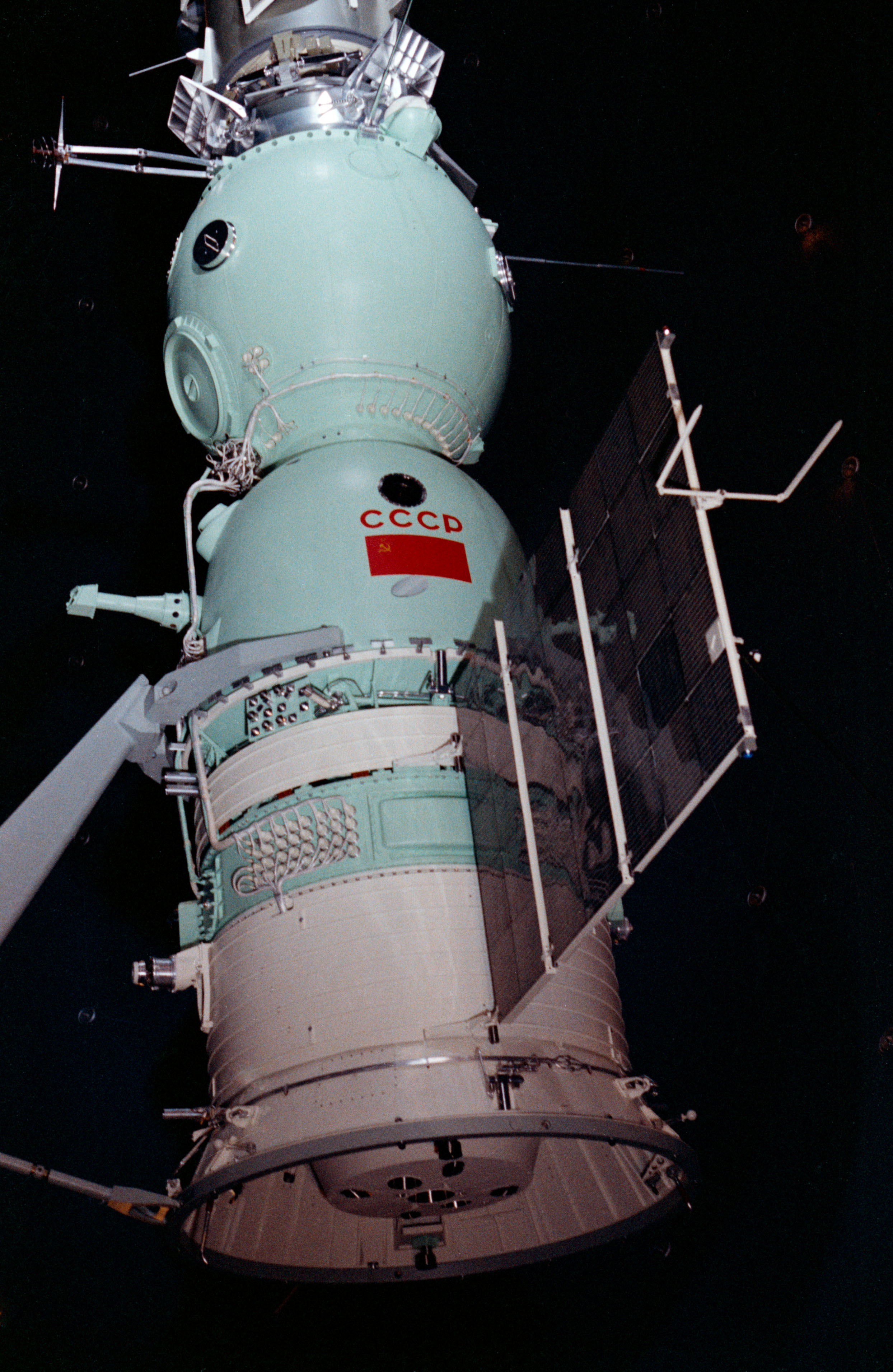 English: S73-27666 (May-June 1973) --- A close-up view of the Soyuz spacecraft which was part of the Apollo-Soyuz Test Project exhibit at the 30th International Aeronautics and Space Exhibition held May 24 ? June 3, 1973 at the Le Bourget Airport in Paris, France. The ASTP exhibit was co-sponsored by the United States and the Union of Soviet Socialist Republics. An agreement between the U.S. and the USSR provides for the docking in Earth orbit of the Soyuz and Apollo in the summer of 1975. The Apollo spacecraft is out of view to the left. At the far left, a mock-up of a Docking Module connects the Apollo with the Soyuz. The spherical-shaped portion of the Soyuz is called the orbital section. The middle section with the lettering ?CCCP? (USSR) on it is called the cosmonauts? cabin. Two solar panels extend out from the machines and panel section. |