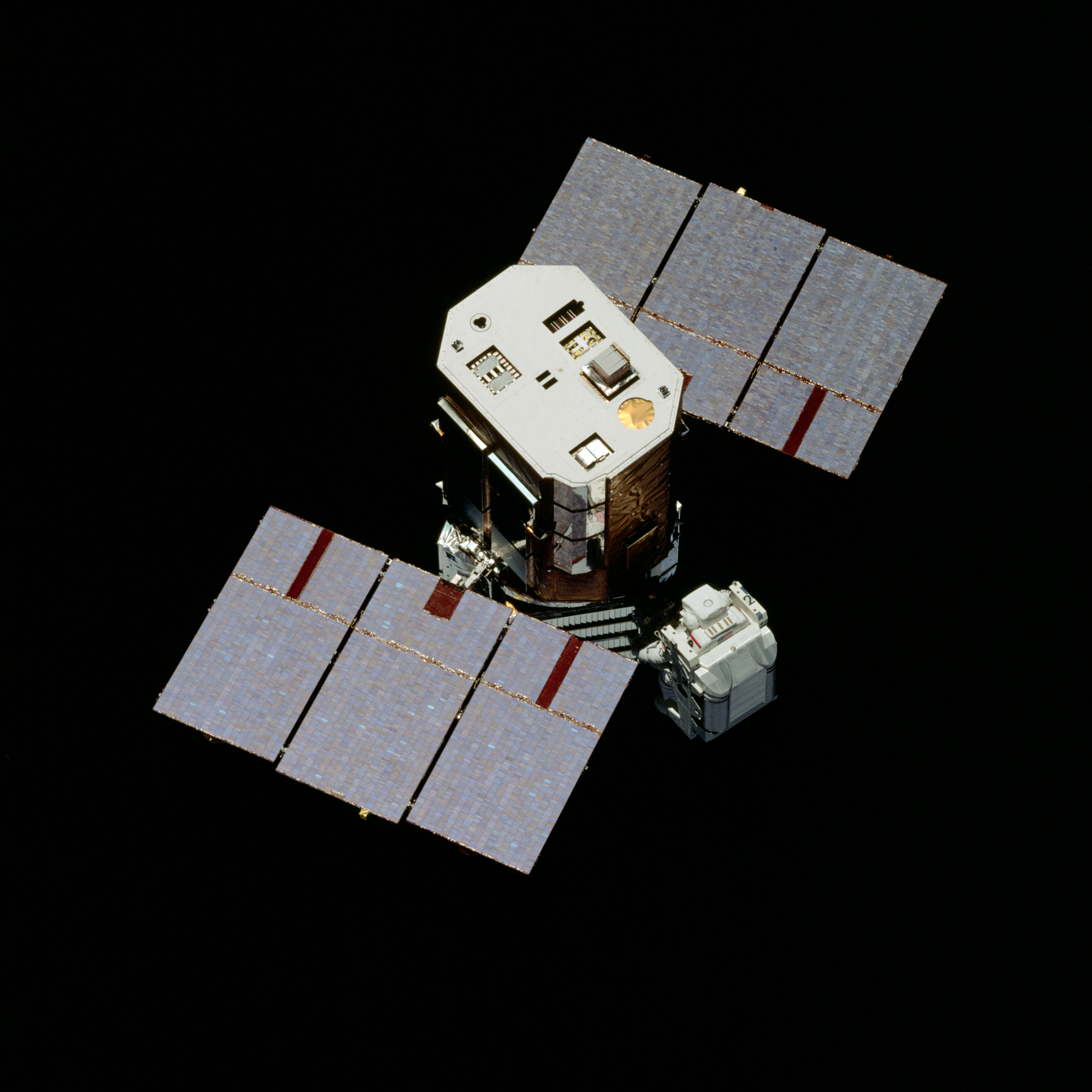 View of the damaged Solar Maximum Mission satellite from Challenger during STS-41-C (41C-34-1380).jpg